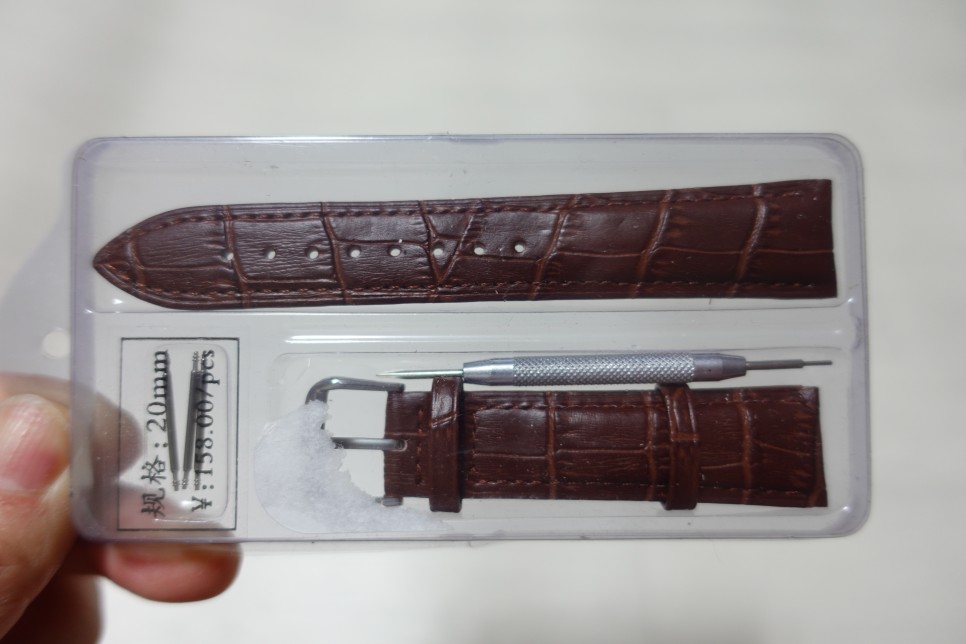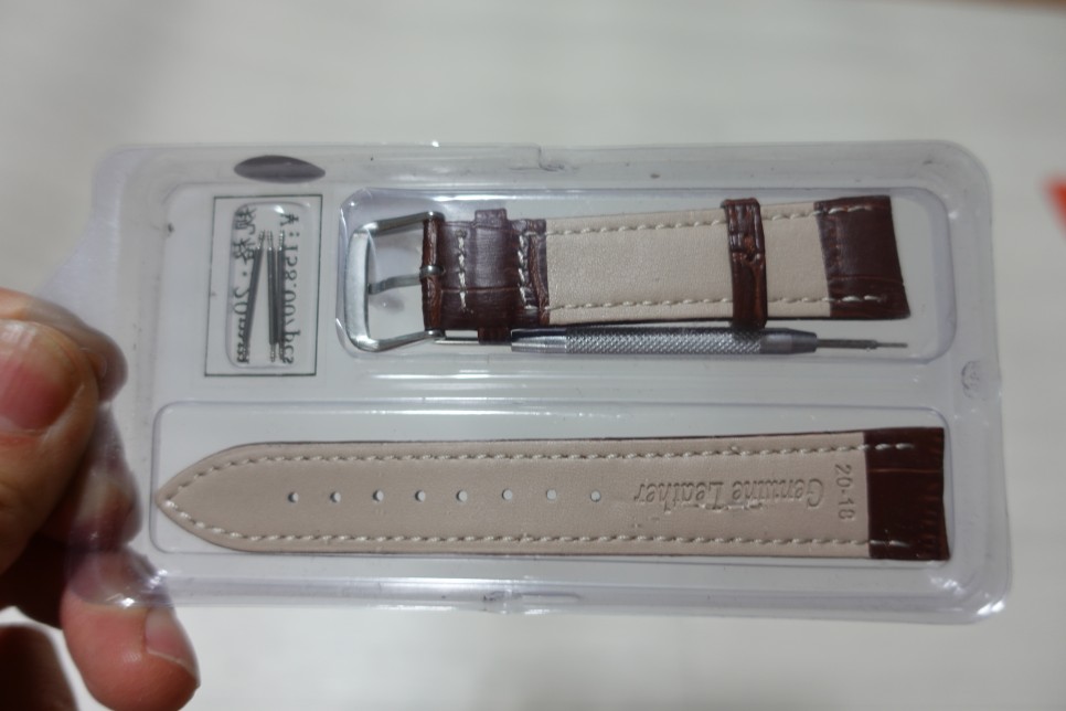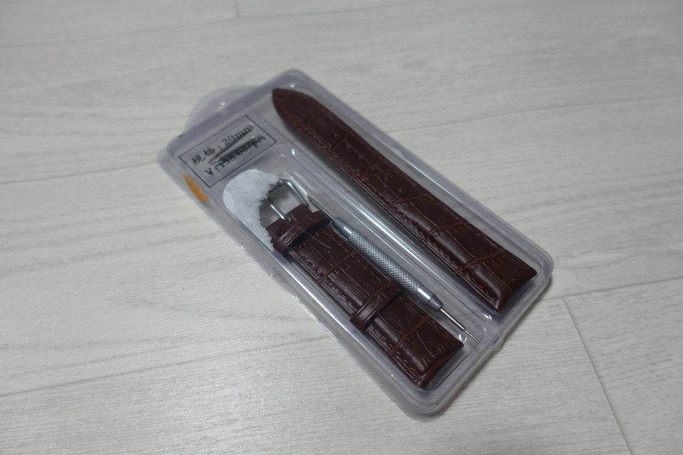 구성품은 브라운 색상의 20mm 소가죽 시계줄 1set, 20mm 스프링바 3개, 스프링바 리무버 1개입니다